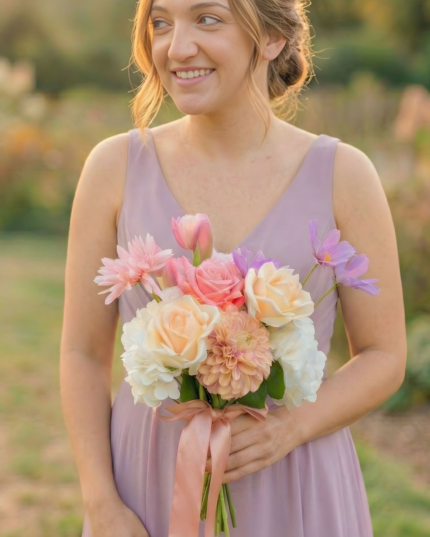 Bridesmaid standing outdoors holding an artificial wedding bouquet of realistic artificial flowers in peaches, whites and pinks from My Faux Florist Canada.