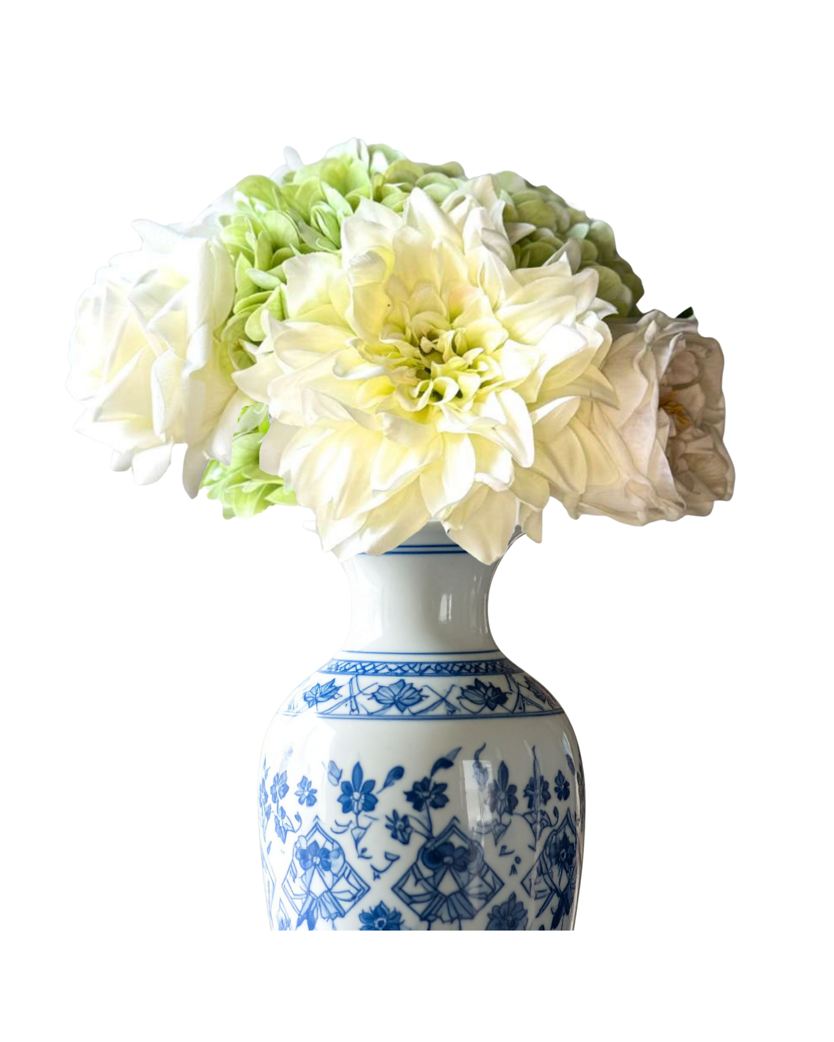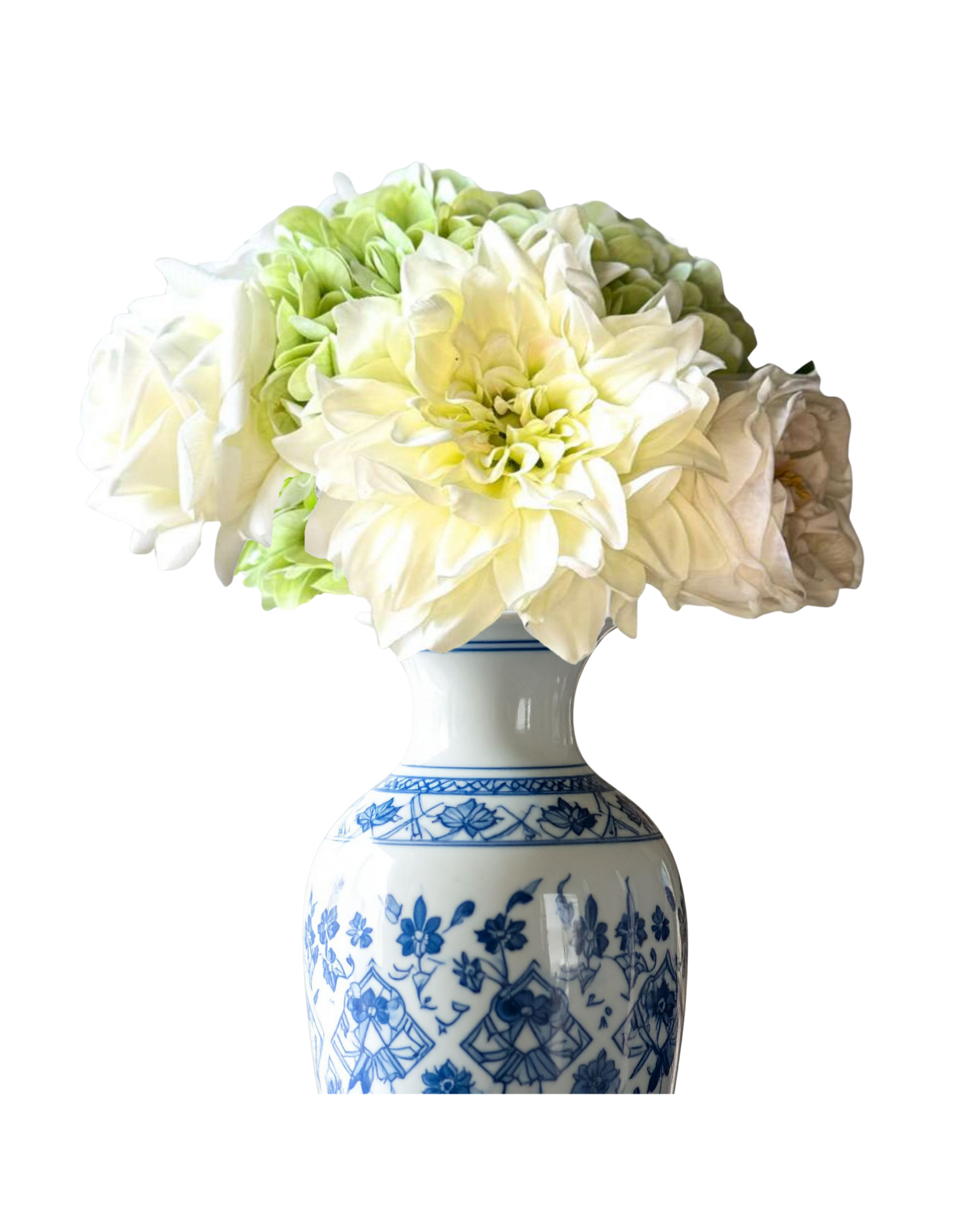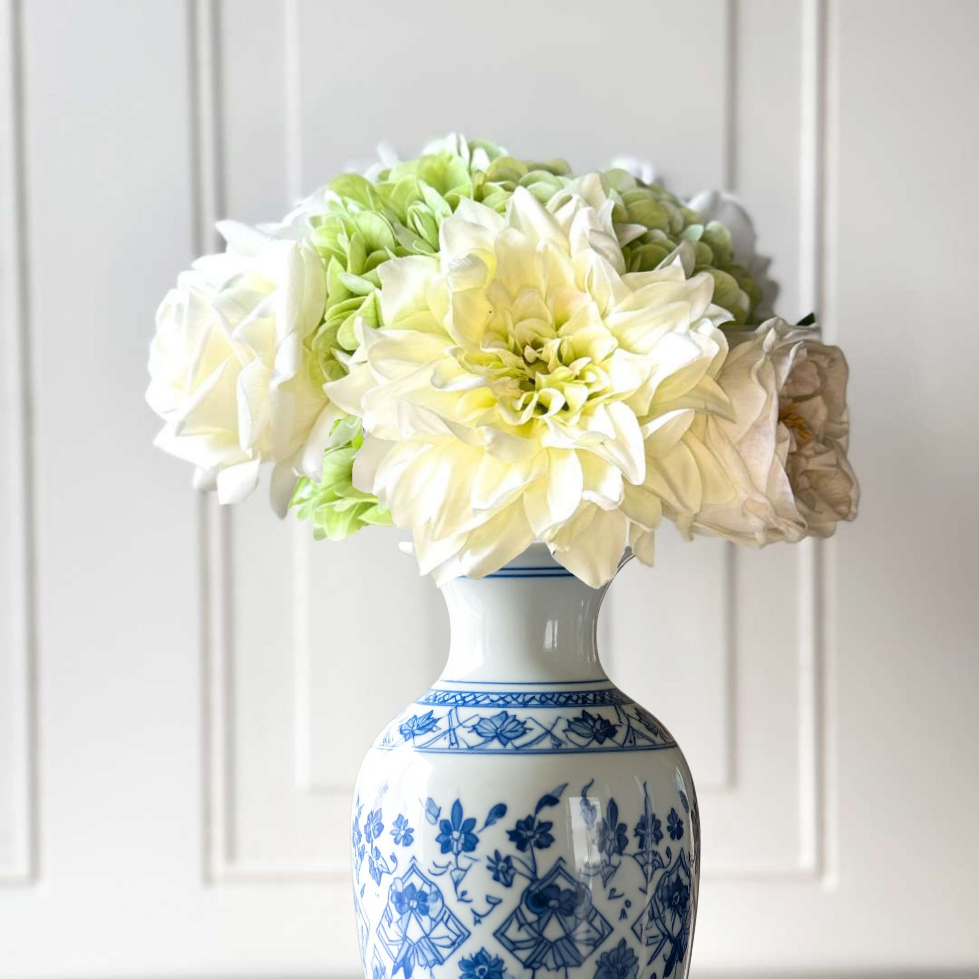 The Matcha Latte brings a fresh take on a neutral palette, blending soft whites with gentle chartreuse greens for a clean and calming look. More compact and low-profile than the Neutral Regency bouquet, it tucks beautifully into smaller spaces like a bedside table, desk, entryway shelf, or cozy reading nook. It also sits perfectly as a low centerpiece on a dining table without interrupting sightlines.