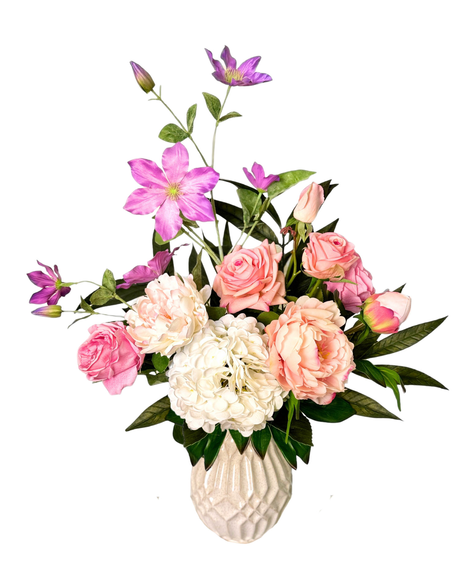 The Vintage Regency is a graceful bouquet of mostly Real Touch stems in soft whites and antique pinks. Full, lifelike blooms and delicately layered petals create a timeless, romantic look that feels both classic and fresh.