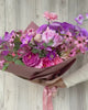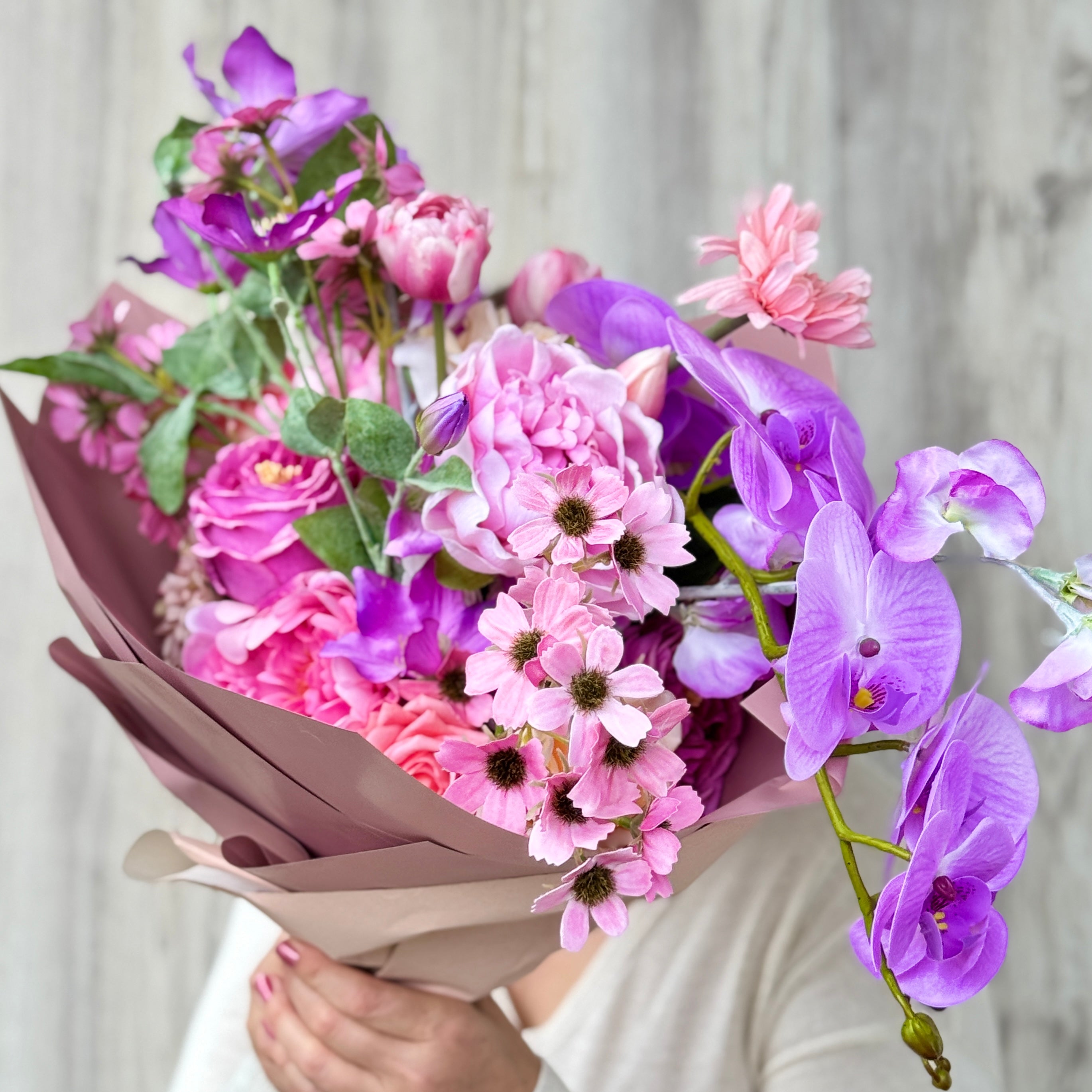 The Grand Gatsby is a full, abundant bouquet that overflows with joyful Spring colour. Layers of lilac, orchid and soft peach mingle with bright seasonal blooms to create vibrant, romantic vibes with unforgettable presence.