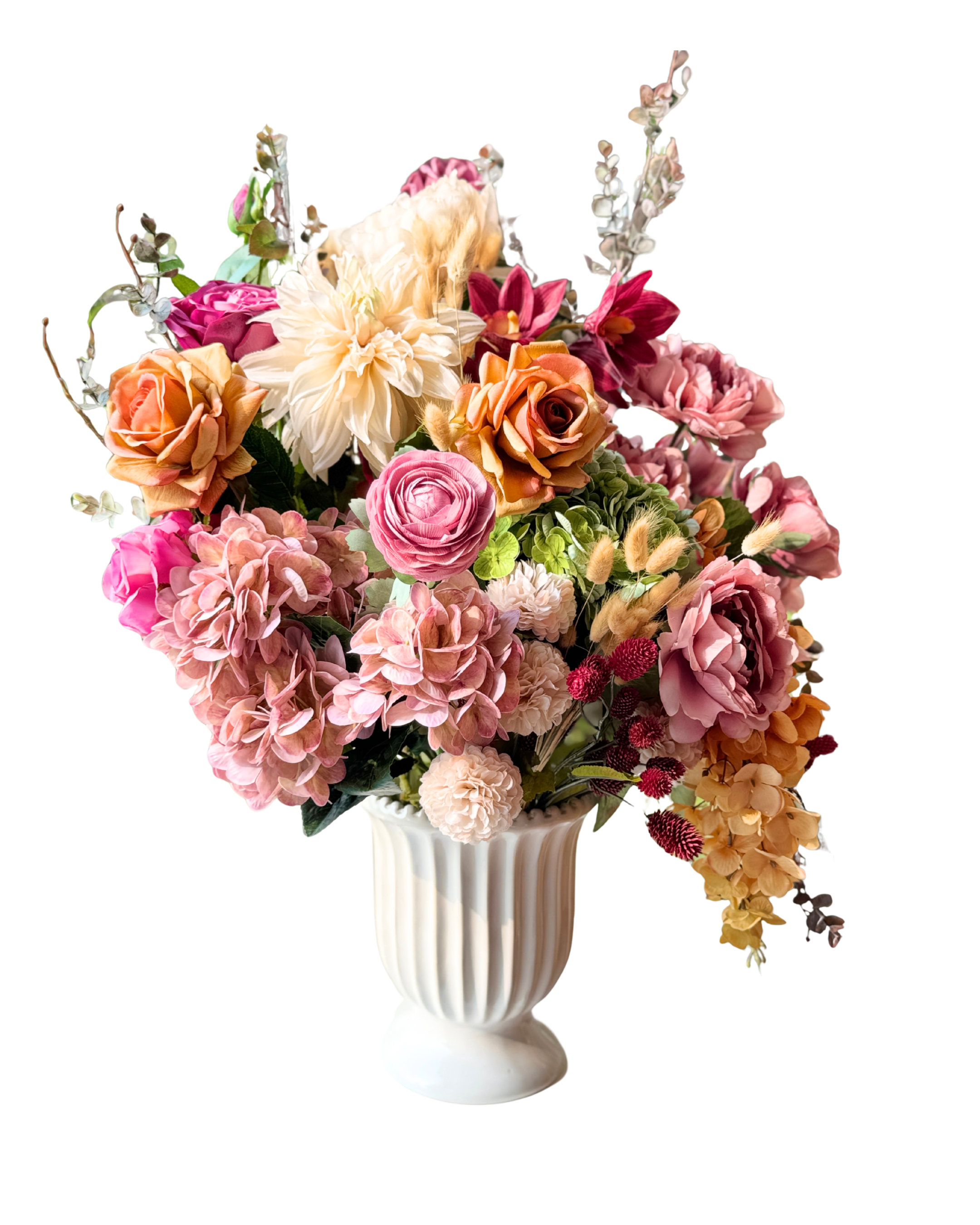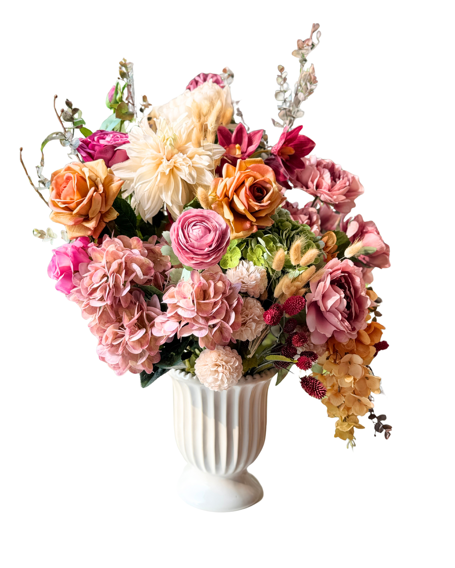The Grand Gatsby is an oversized bouquet that stands above the rest, overflowing with rich seasonal colour. Warm gold, soft blush, and deep burgundy mingle with touches of rose and cream to create a dramatic yet refined look. Handcrafted from premium silk and Real Touch flowers, it’s designed to make a statement. A centerpiece that captures the glamour of the season with elegance worthy of its name.