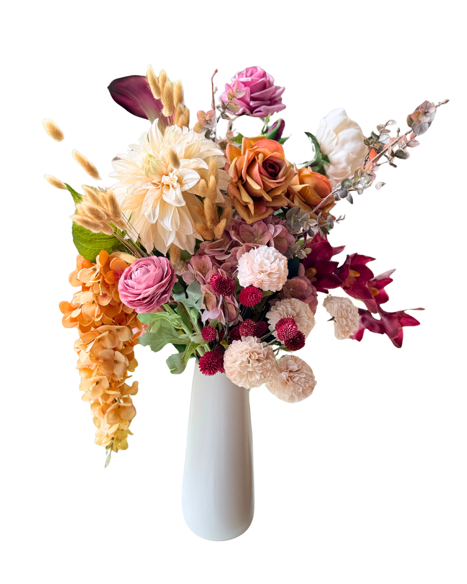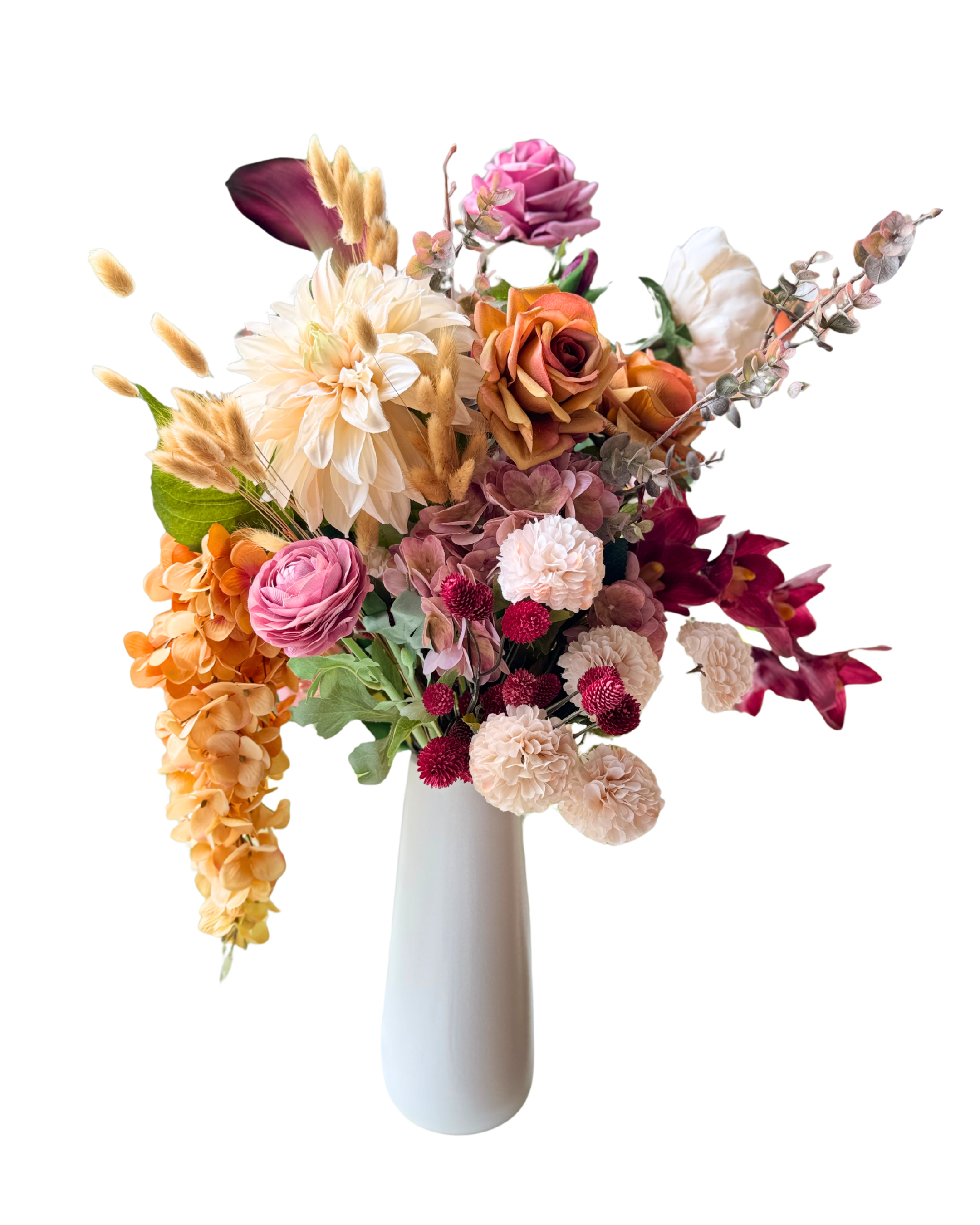 The Victorian in Fall Colours blends the romance of the Victorian era with the richness of autumn. Soft creams and golden tones mingle with warm spice shades and deep burgundy accents, creating an arrangement full of depth and drama. Handcrafted from a mix of premium silk and Real Touch flowers, it captures the elegance of the season in warm, timeless tones.