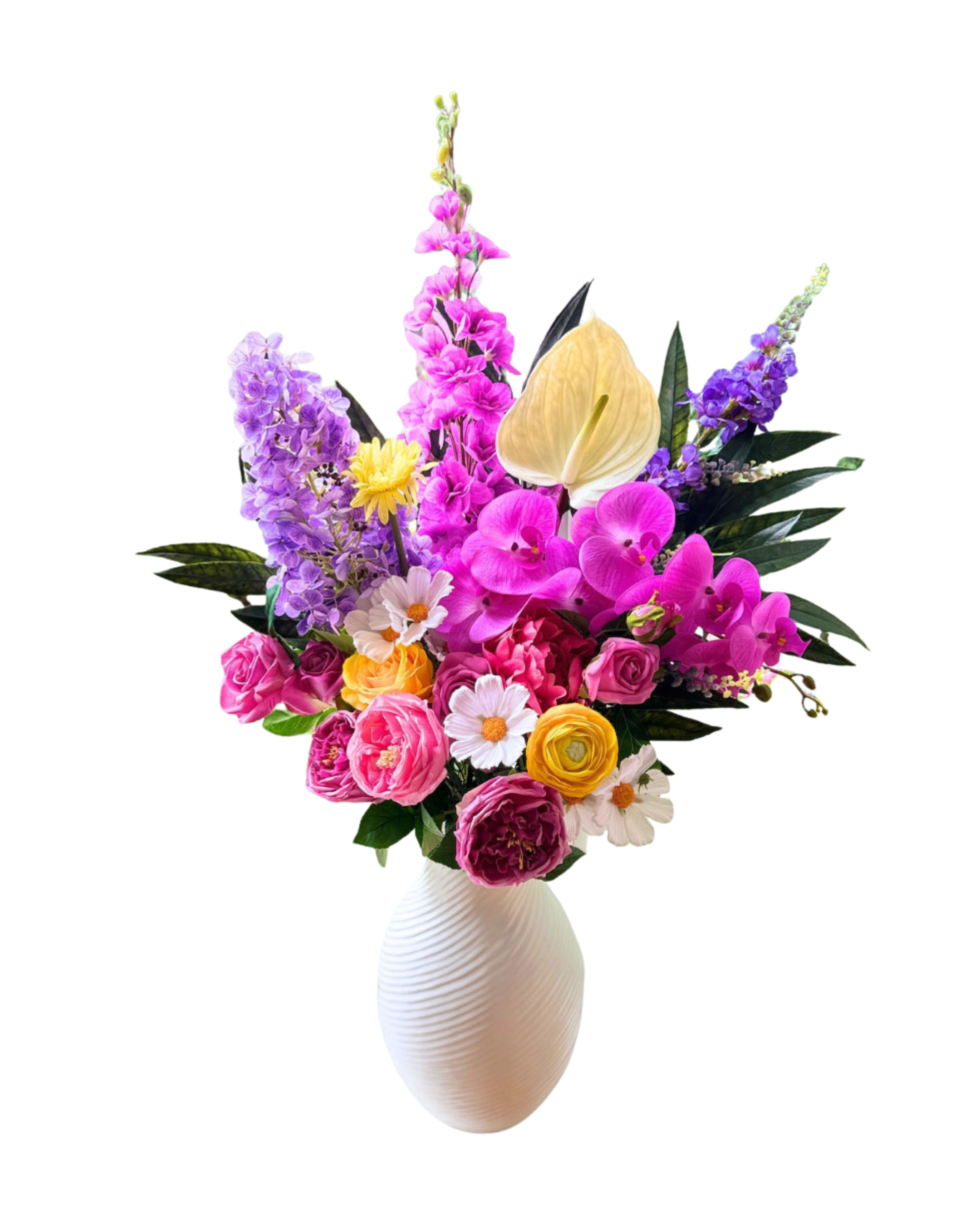The Vibrant Victorian is designed for those who love bold expression. A striking fuchsia delphinium, gracefully draping orchid, and voluminous hydrangea form its heart, surrounded by Real Touch and other premium